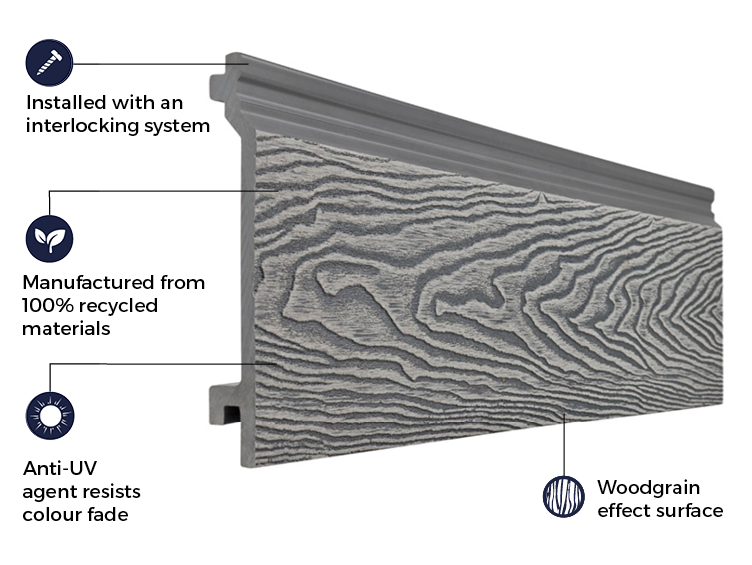 Cladco Woodgrain Composite Cladding Boards allow you to effortlessly achieve a wood cladding look on your exterior walls. The woodgrain texture gives a natural wood effect.