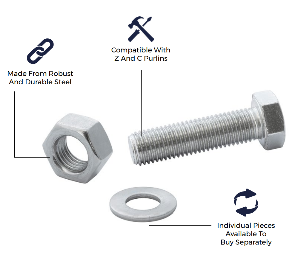Cladco bolt set for purlins are ideal for securing your roofing or cladding purlin structure. Compatible with both our C purlins and Z purlins, these bolts are for fastening roofing or cladding sheets and framing.