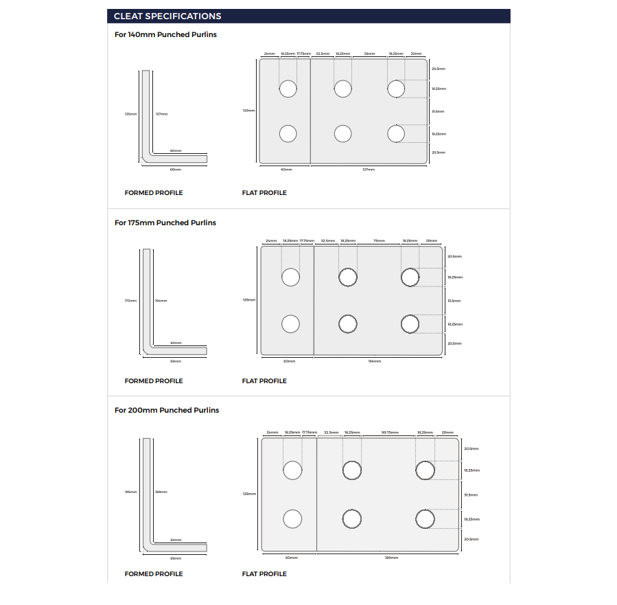 Clado metal pre-punched cleats are designed specifically with our existing Z and C purlins in mind. These corresponding purlin cleats ease the installation process of purlins onto the structural frame, ideal for either cladding and roofing projects.
