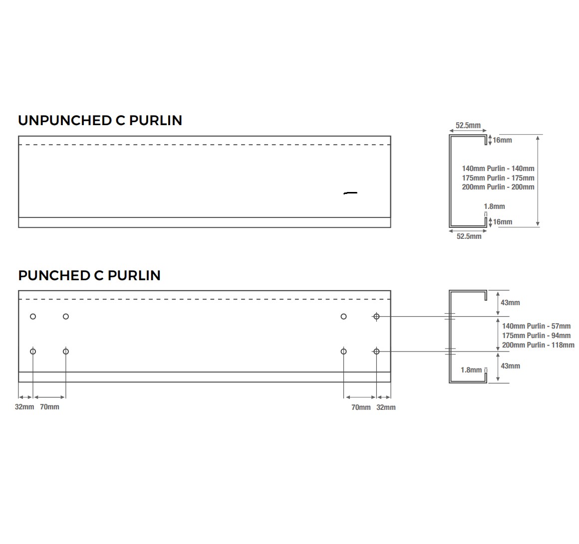 Punched C Purlins are compatible with our Purlin Cleats, while unpunched options offer flexibility for bespoke installations.
