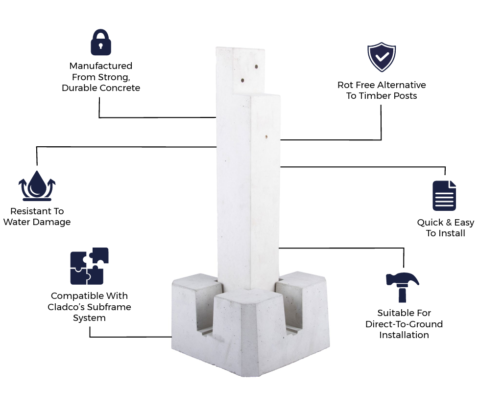 With the versatility of being installed directly into the ground or within a concrete decking block, depending on the project, the posts are designed to ease the decking building process. The concrete material provides resistance to water damage and decay, creating a reliable and rot-free alternative to timber support posts.