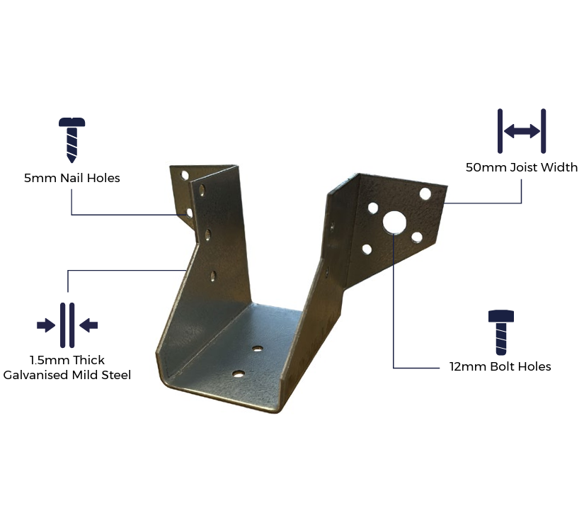 This 50mm x 75mm hoist hanger is designed to securely support timber joists in more compact structural builds. With an internal width of 50mm and a height of 75mm, it’s fully compatible with our 50mm x 100mm timber joists, ideal for smaller decking subframes and lightweight timber constructions.