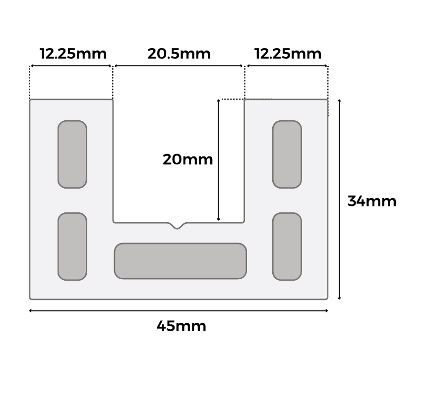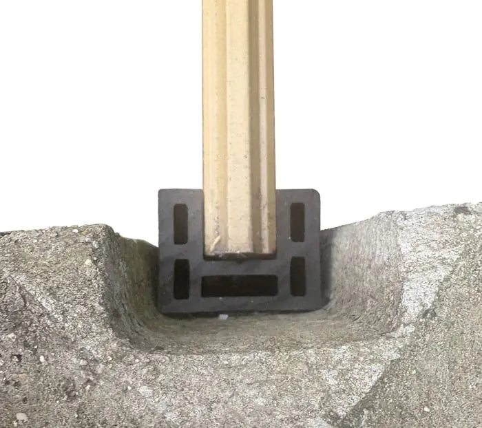 The interior face of each spacer includes a V-shaped groove running the full length. This groove marks the fixing point against the concrete post, ensuring correct alignment during installation.