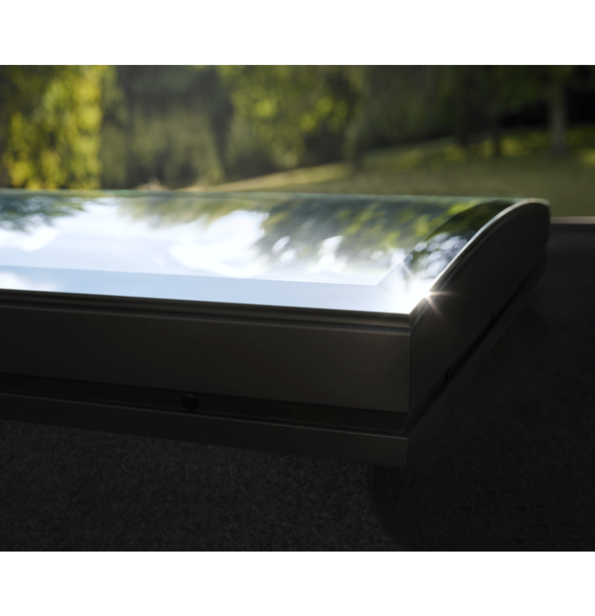 The curved glass top unit combines top technical performance with an updated, slimmer curved design, which is unique in the market. The patented curved-shaped glass top drains off rainwater easily even at 0° roof pitch, and the glass-to-edge design gives a clear view to the sky. The outer glass pane is toughened and weather-resistant for reliable protection against the elements and extra peace of mind.