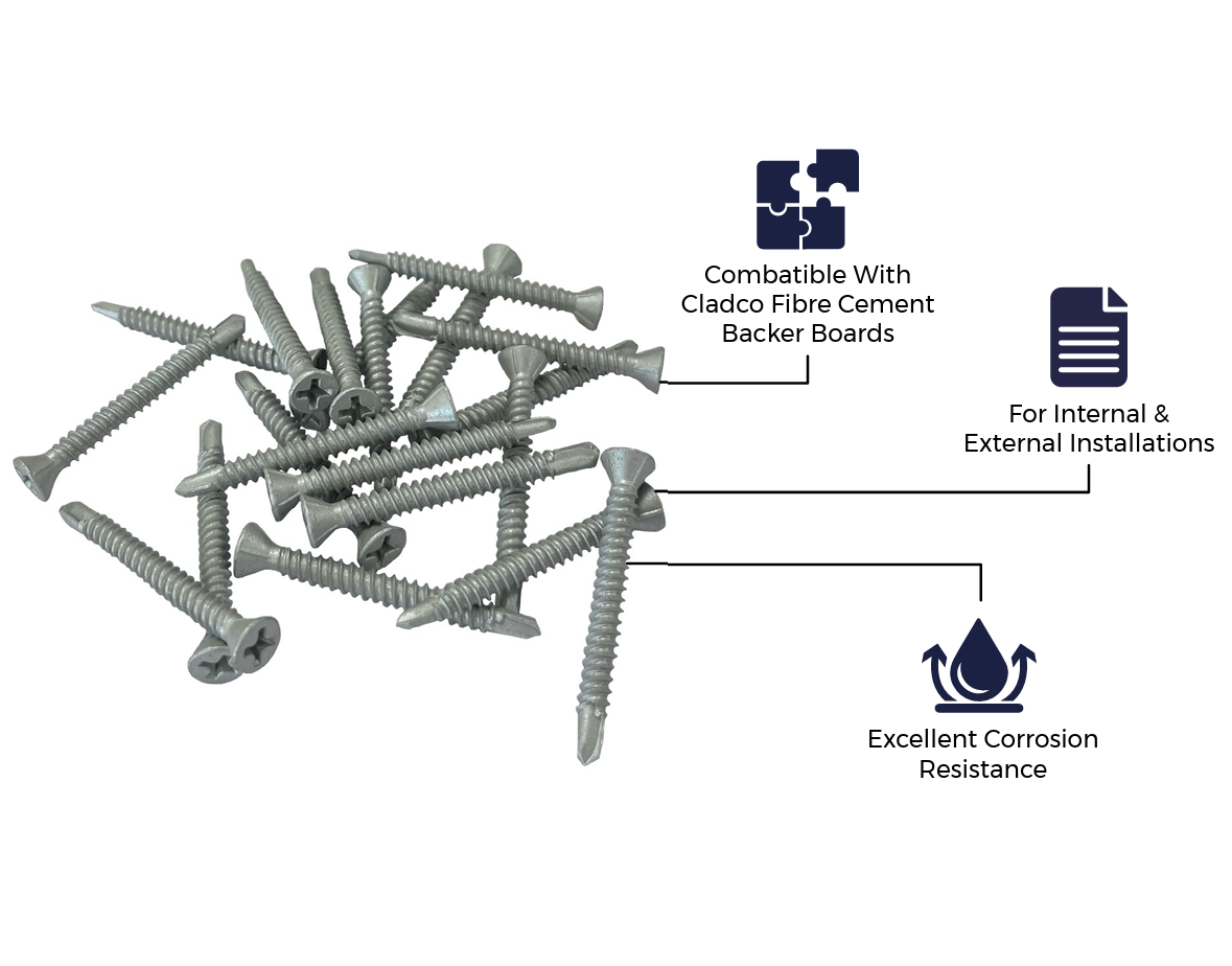 Cladco backer board screws provide a secure, long-lasting fixing for fibre cement backer boards in bathrooms, wet rooms, kitchens and other high-moisture areas. Manufactured to industry standards for pull-out strength and corrosion resistance, they deliver a flush and neat finish that is ready for tiling or further installations.