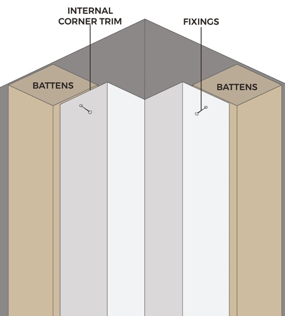 Creating an accurate fibre cement click cladding system is made easy using this trim. Fitting the trim into the internal corner of the system provides durability as well as finished lines.