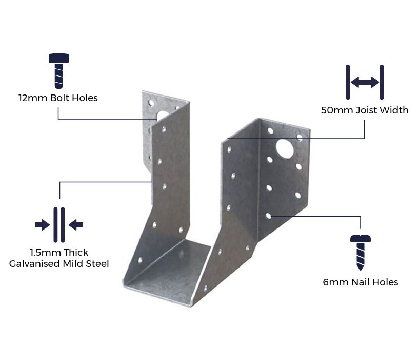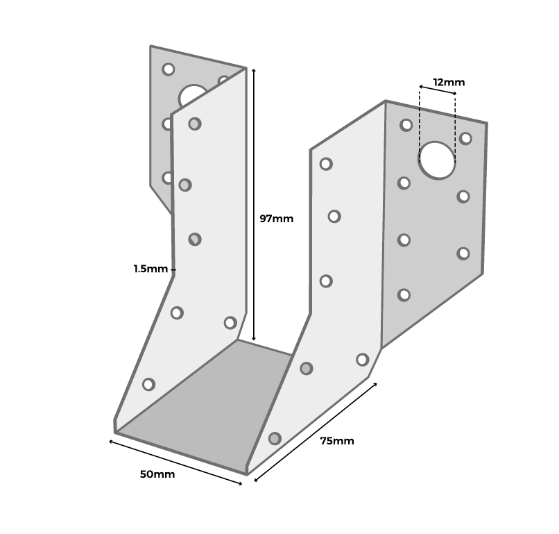 Measuring 50mm wide by 97mm high, face fix joist hangers can be secured using square twist nails (30mm x 3.75mm). The 12mm bolt-hole fasteners provide extra stability.