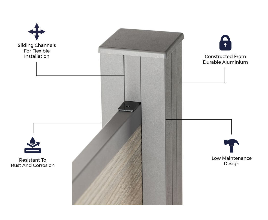 The posts have a sliding channel on three of the four sides, leaving a gap for the fencing panels to slot within and finish the system. The remaining inserts can be removed depending on the installation. Where the post is situated between fencing panels to create a straight line, the opposite channel can be removed. Or if being used to create a right angle where two sides of the fence meet, the perpendicular channel insert can be taken out.