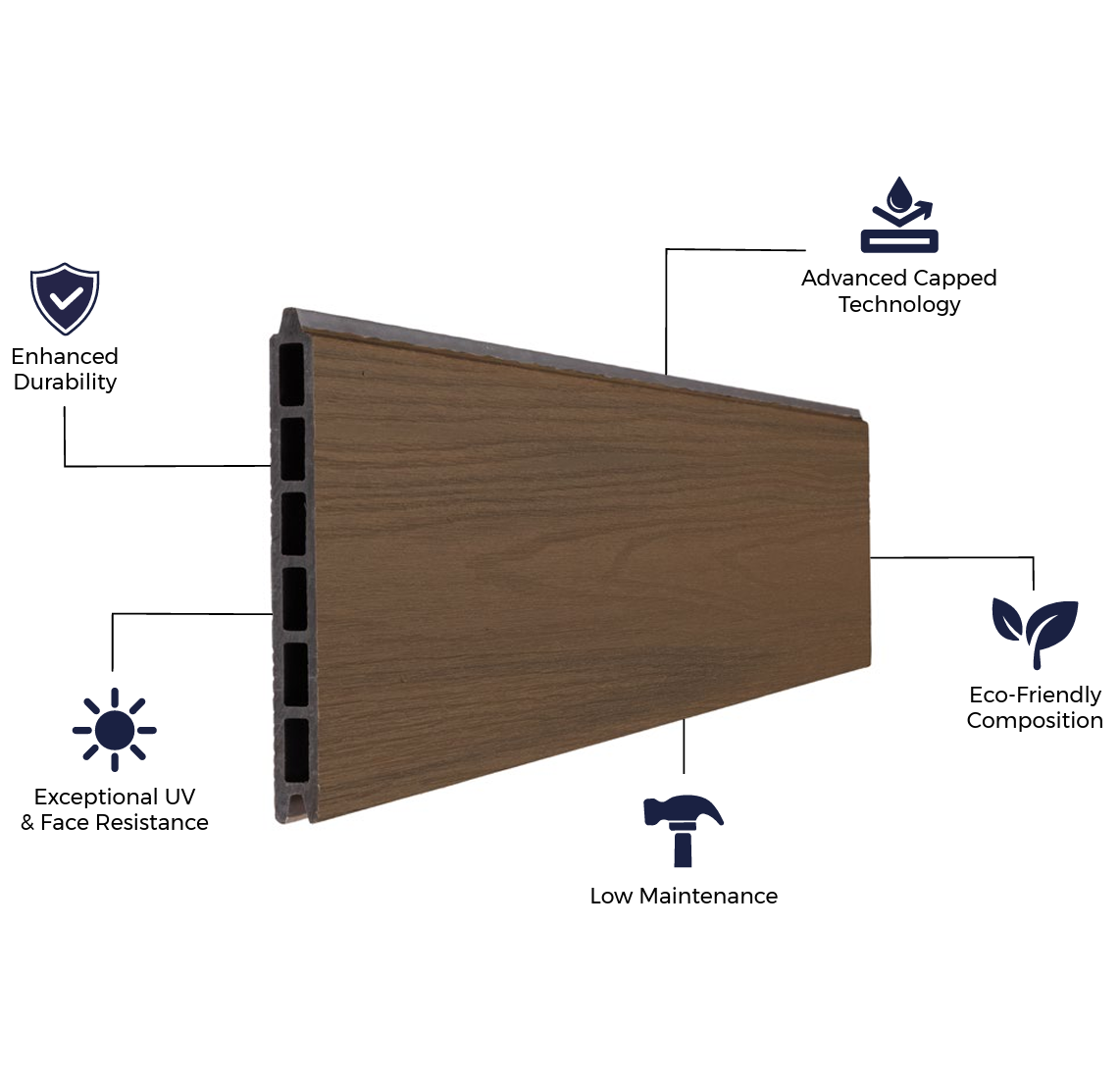 These woodgrain effect composite fencing panels are the next-generation of fencing solutions. The composite core is made from entirely recycled materials, with a mix of recycled wood fibre and post-consumer plastics. What makes these panels strong is a polymer capping that surrounds this core to provide protection. Cladco ProFence composite fencing panels feature a composite core made from 100% recycled materials, consisting of 60% recycled hardwood fibres and 40% recycled post-consumer plastics—helping to reduce environmental impact. Each panel is capped with a durable polymer shell, enhancing resilience and protection. This advanced surface layer increases resistance to weathering, scratching, staining, and UV fading, ensuring long-lasting performance and appearance.