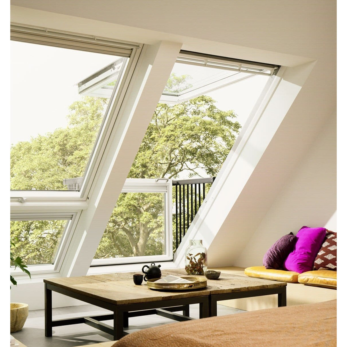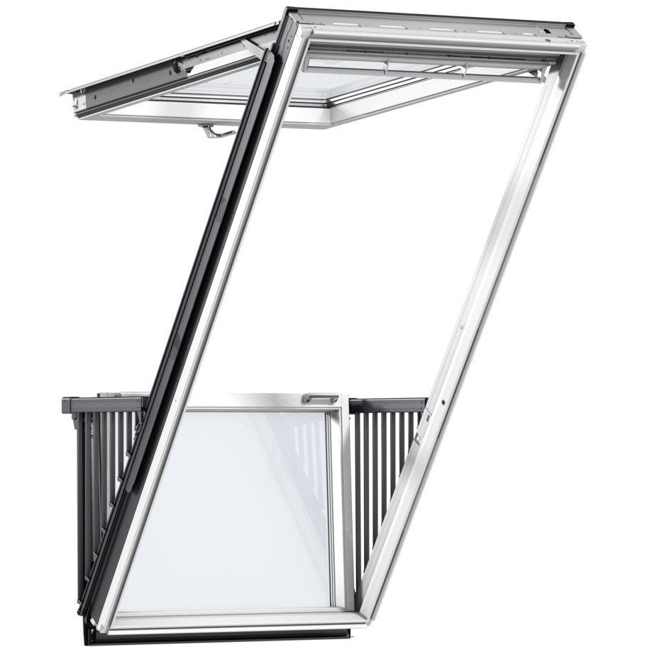 - VELUX Cabrio® white painted roof window with optional one or two side units (GPL Top-Hung and GIL fixed element).