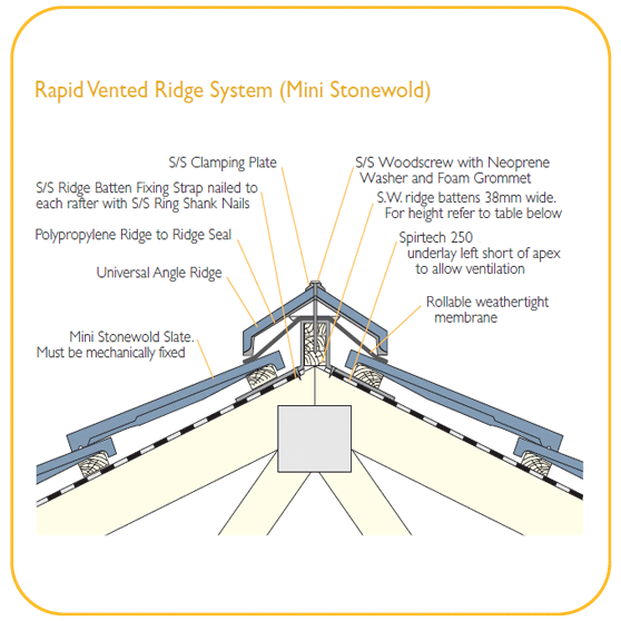 One carton of the Rapid Vented Ridge System contains sufficient components to fix 5 metres of ridge without the need to leave the roof. The Rapid Vented Ridge System also gives a traditional appearance to the ridge whilst combining the security and weather tightness of mechanically fixed ridge tiles.